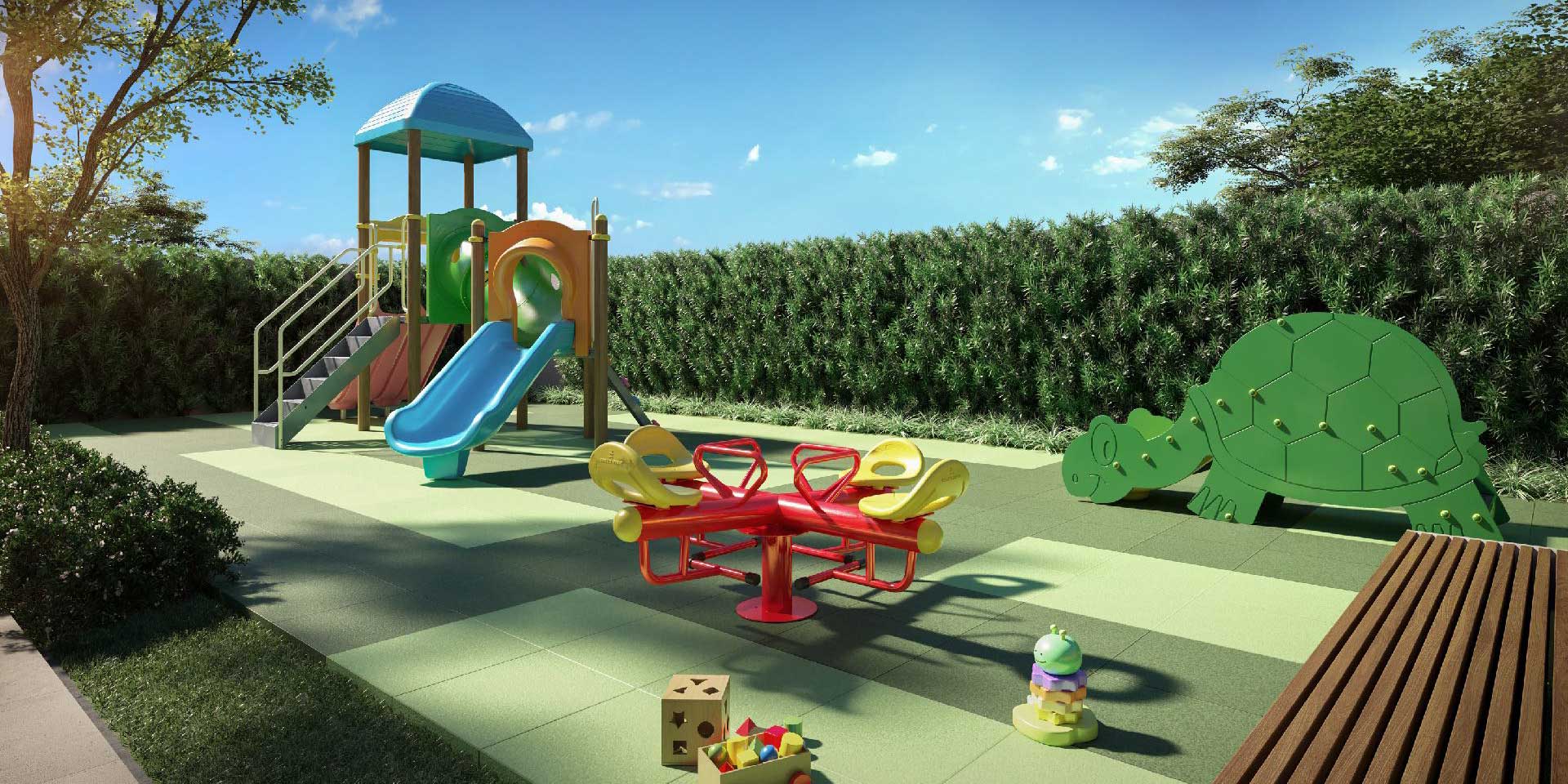 - Playground: Espaço externo para a criançada se divertir com segurança.